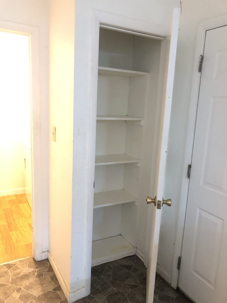 Extra closets in this home! This 3 bed 1 1/2 bath brick for rent in Idabel, OK, has a large clothing closet in the hall in addition to the clothing closets in the bedrooms, and coat closet by the front door. Then factor in other storage such as the ceiling to floor pantry in the kitchen. The shelves in the bonus room cover an entire length of the long wall with open shelves above the ones that are enclosed in cabinets and then there’s the cabinets over the washer and dryer plus nice sized linen/towel shelves the hall bath. Large storage building/shop in the back yard.
